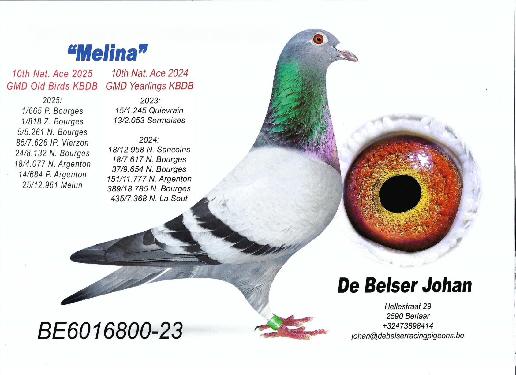 Melina (BE23-6016800) bevestigde haar uitzonderlijke klasse. Zowel in 2024 als in 2025 werd zij 10° nationale asduif en bovendien beste oude duif nationaal op 8 vluchten.