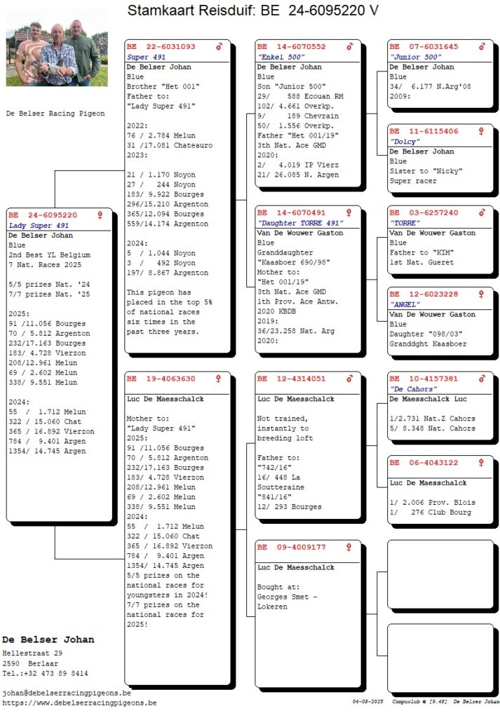 Deze topduiven zijn bekomen door een selectie te maken uit mijn eigen basislijnen (Oskar, Fijneke, Junior 500, …) gekoppeld aan de beste lijnen van de bijgehaalde duiven van De Belser Victor (Berlaar), Van De Wouwer Gaston (Berlaar), Maris Jozef (Itegem), Engels Jul & Yves (Putte), Vervoort Luc (Hallaar).
